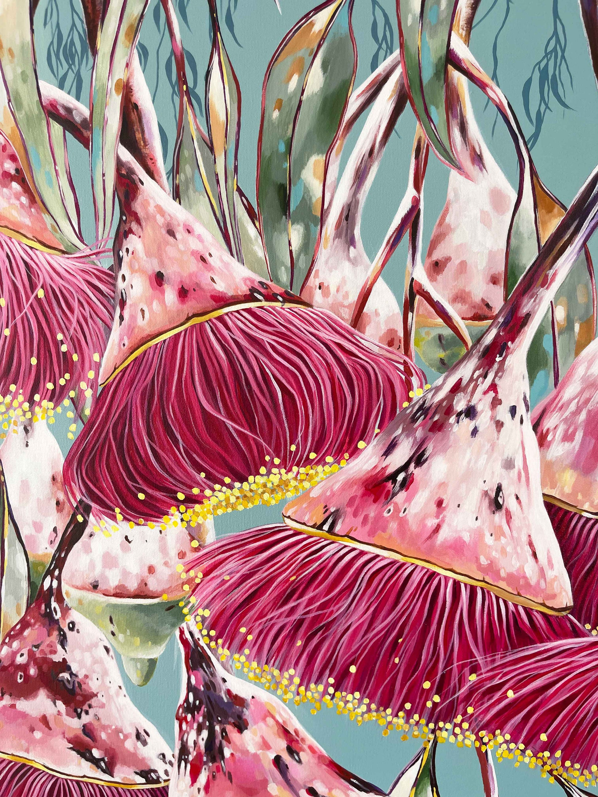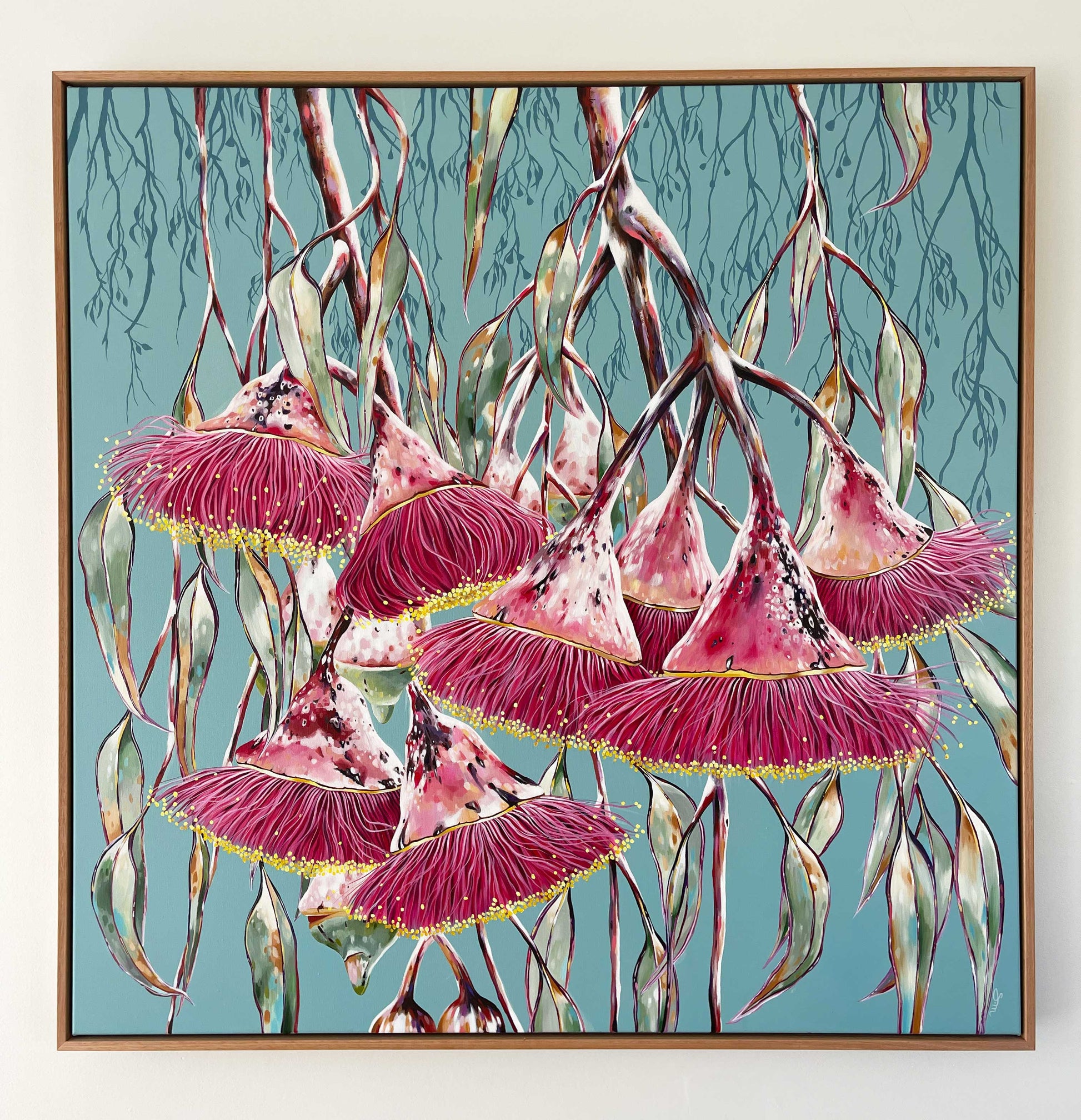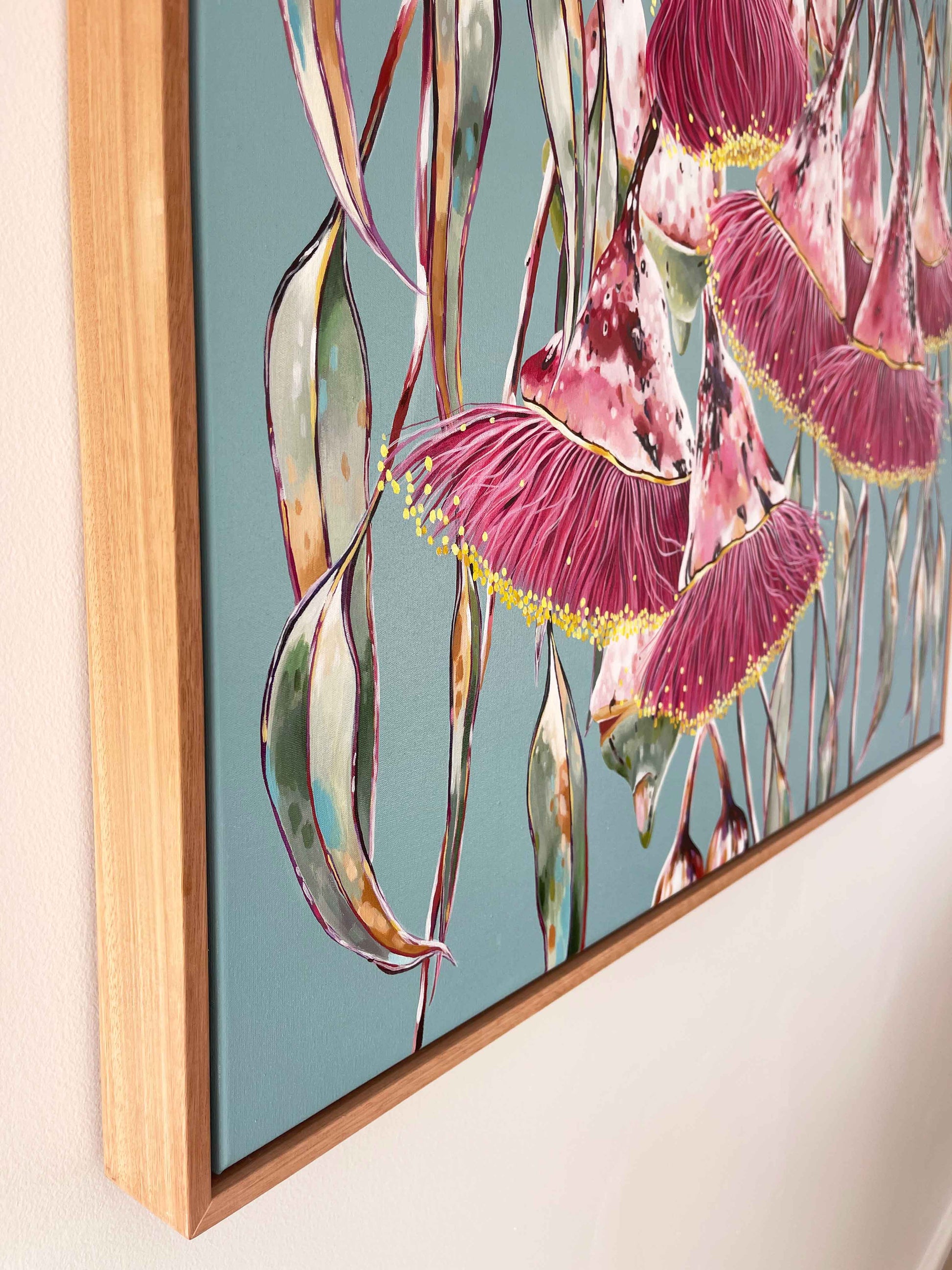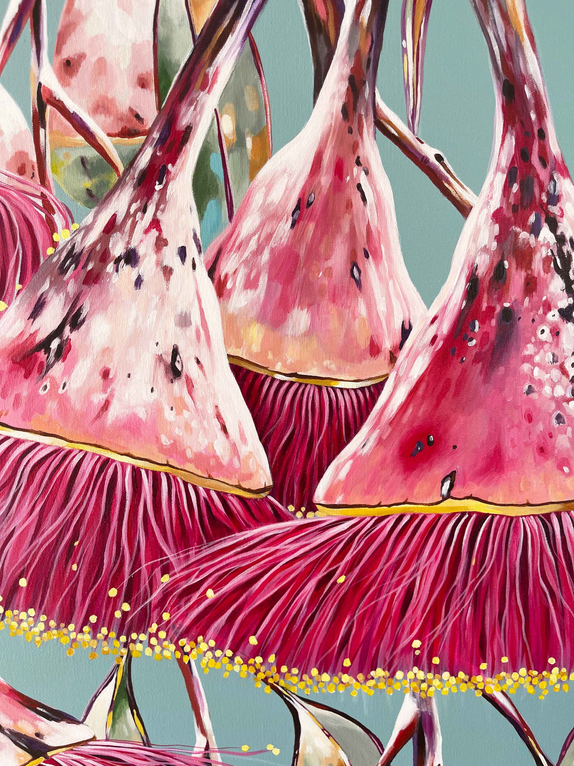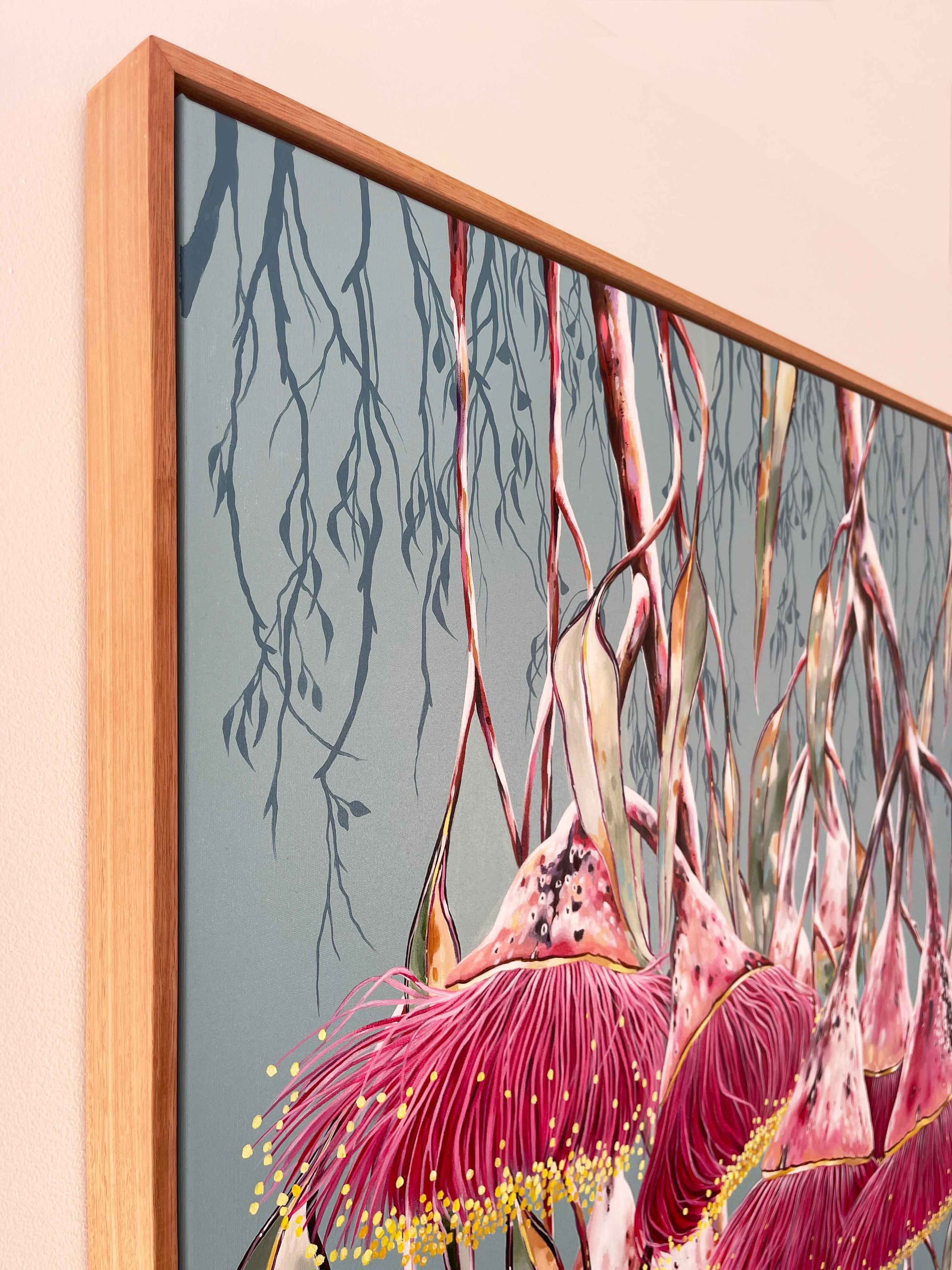 I love the hidden beauty of these trees. After a huge rain shower, the tree looks so different. The ghostly white powder coat is striped bare and replaced with bold reds and pinks. It adds a whole other dimension of wonder. Each time I paint a Silver Princess, I aim to celebrate a different version of it, as it changes all the time. 'After The Rain' is for anyone who feels a connection to these beautiful Australian natives and enjoys their artwork bold!