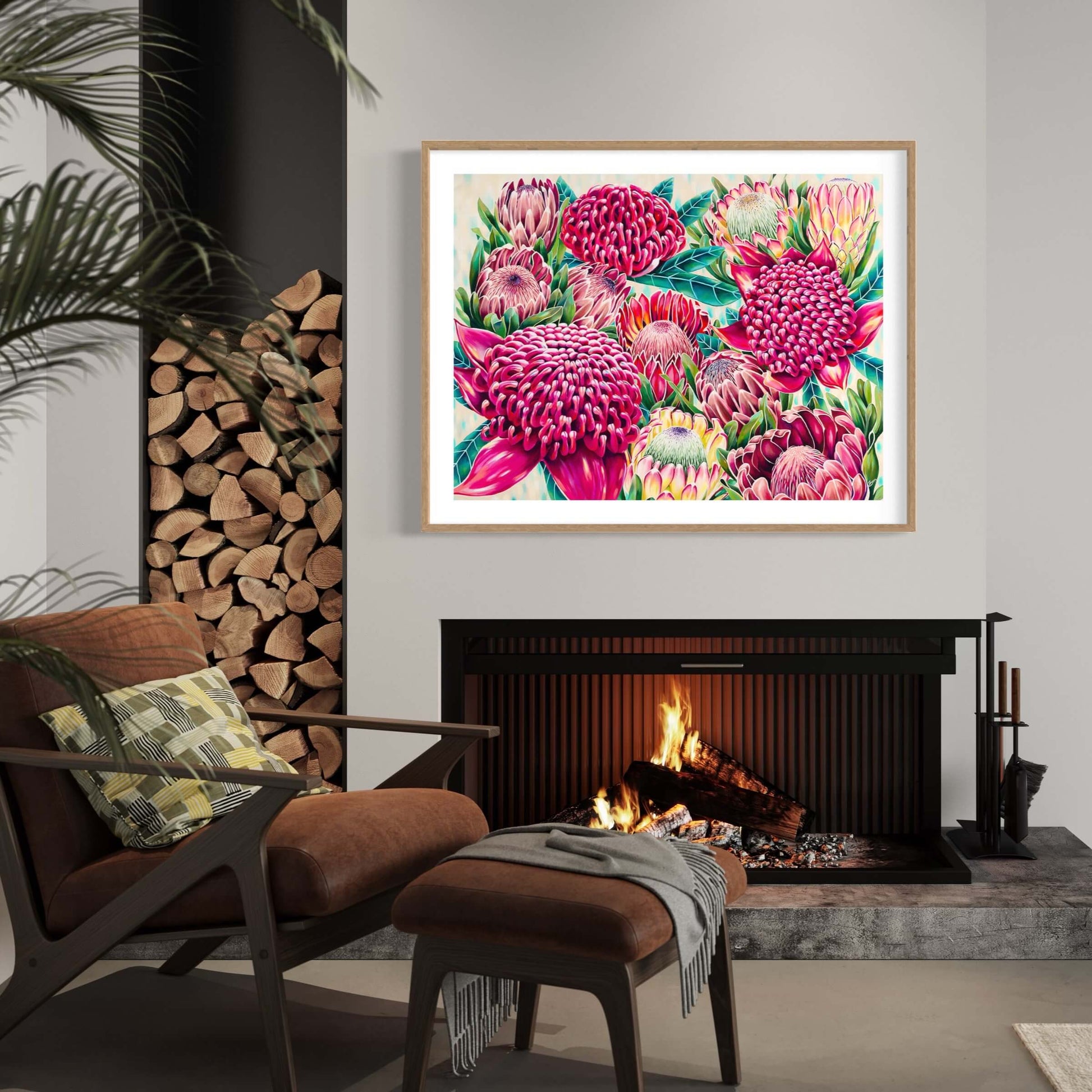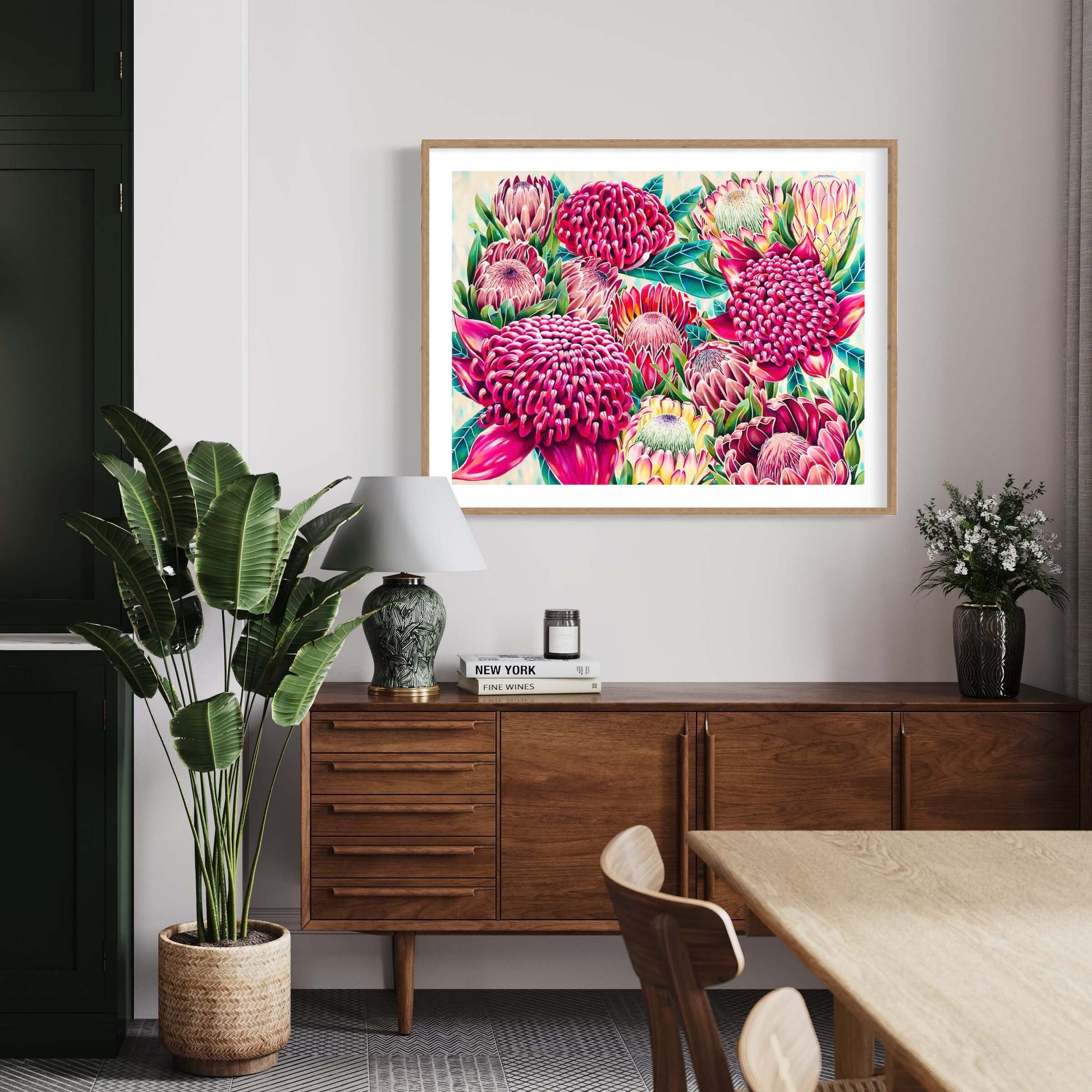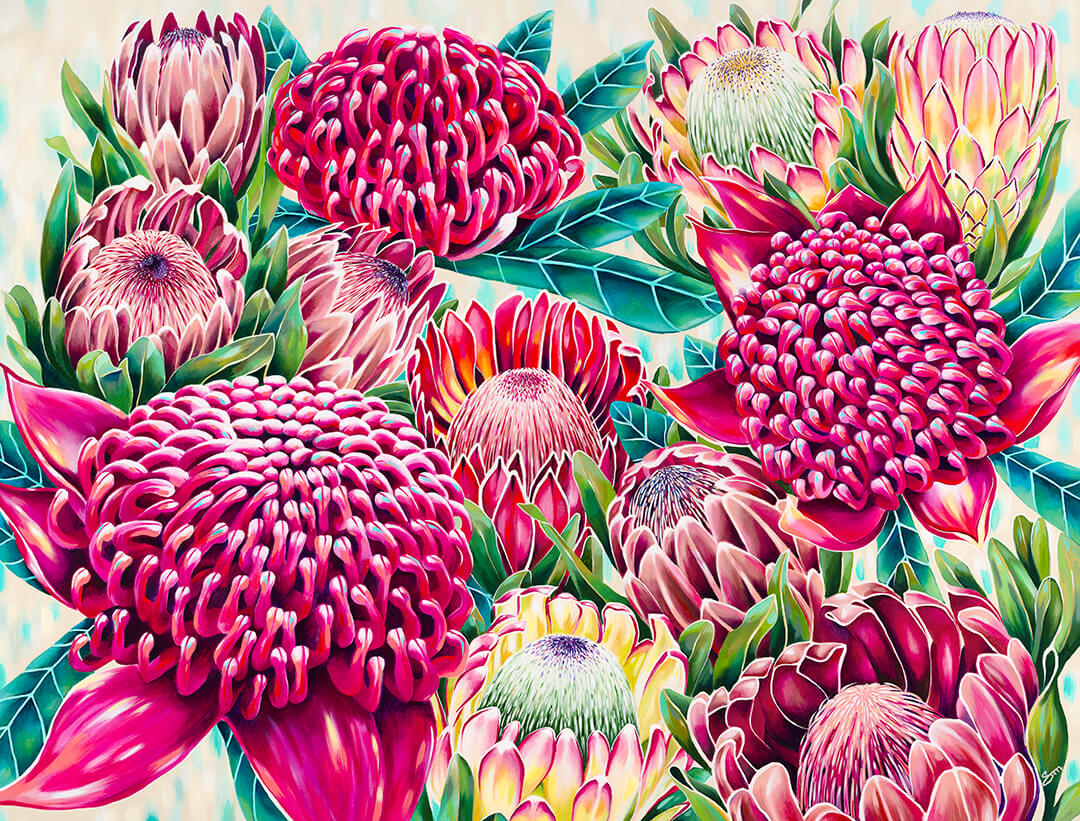 This piece is for admirers of Waratah and Protea, or for anyone who enjoys colours and forms which are bold and bright! Artistically, I'm fascinated by the architecture of flowers. The perfect little structures that nature creates are inspiring and full of wonder. The beautiful forms and fascinating repetition invites the eyes to travel over them. I loved honouring these forms in Crimson View by creating a garden view where these iconic flowers are the stars of the show.