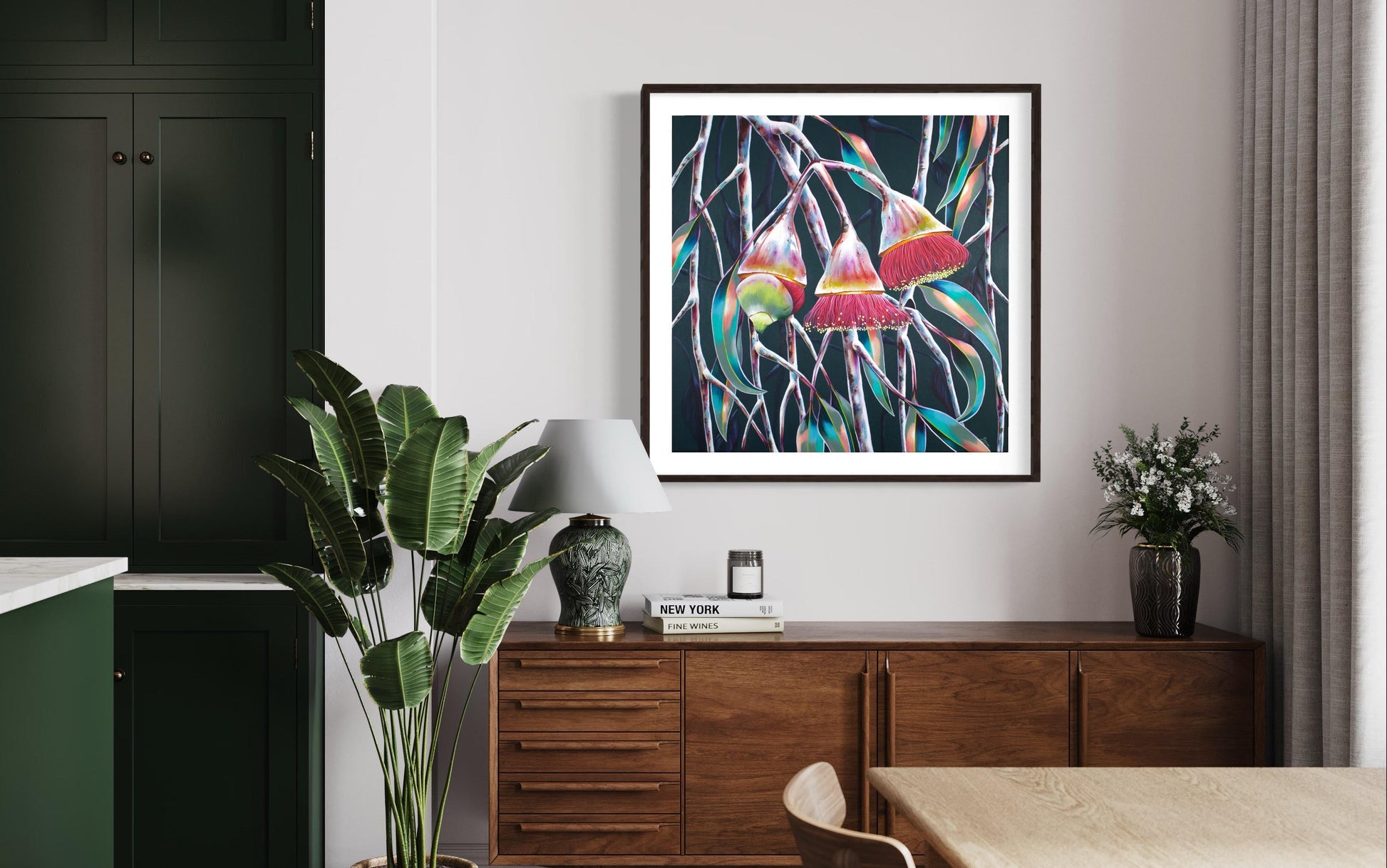 Featuring a moody backdrop of deep green and colourful gum leaves moving in the breeze, there’s something special about ‘Hats Off’. The original of this beautiful Australian native was hand painted in acrylics on canvas.